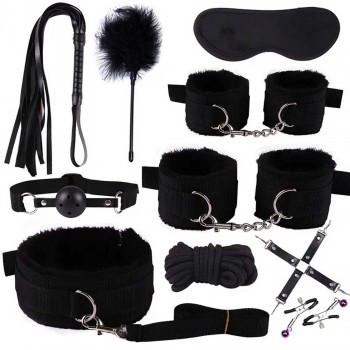 10-teiliges BDSM-Set: Handschellen, Stehhandschellen, Riemenhalsband, Maske, Ballgag, Seil, Kitzel, Flogger Whip, Hogtie, Brustwarzenklemmen und Peitsche