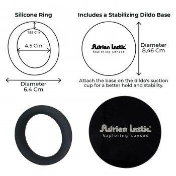 Der Dildo ist mit der Verankerung am Ring befestigt und kann auf jede Art von Dildo eingestellt werden, solange er eine geeignete Basis hat und sein Durchmesser 4,5 cm (1,75 Zoll) nicht überschreitet.