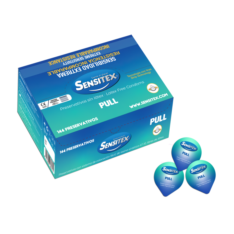 Sensitex Pull Sans Latex (144 pcs) Préservatifs avec système PULL facile à poser, en résine synthétique AT-10 et sans latex.