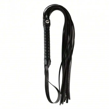 8-piece BDSM set in black with pink inner lining, includes: Collar, Strap, Hand Handcuffs, Ankle Handcuffs, Gag, Whip, Bandage and Nipple Clamps
