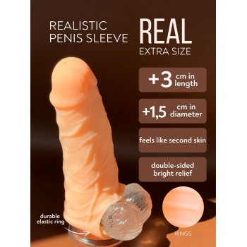 The Real Extra Size penis sleeve increases the length of the penis up to 3 cm. The fixing ring is very soft and stretches perfectly. Despite its delicate material, it allows the case to be securely attached, protecting it from falls. The shiny double-sided embossing of the case (realistic exterior and rings on the inside) stimulates both partners at the same time during sexual intercourse and provides more pleasurable sensations. The inner seal does not feel like a foreign object and is very comfortable during sexual contact. It does not fall or bend like an accordion, but the partner feels it as part of the penis.