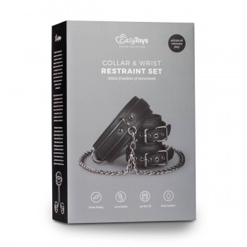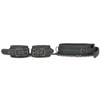 Collar set and handcuffs of synthetic leather lined together by metal chain