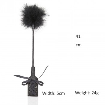 Frusta con un'estremità di piuma e l'altra di pala con corsetto a croce e forma rettangolare. Lunghezza 41cm