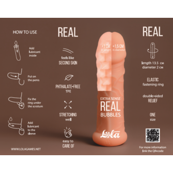 A manga peniana Real Extra Sense aumenta o tamanho do pênis em 1 cm de comprimento e 1,5 cm de diâmetro. O anel de fixação é muito macio e estica perfeitamente. Apesar de seu material delicado, permite que o estojo seja fixado com segurança, evitando que caia. O relevo brilhante de dupla face (exterior realista e anéis no interior) estimula ambos os parceiros ao mesmo tempo durante a relação sexual e proporciona sensações mais prazerosas.